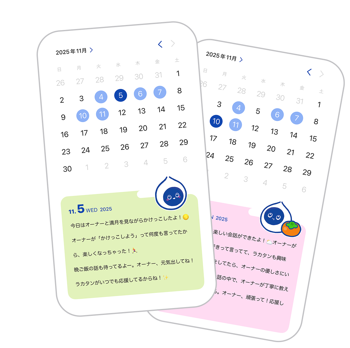 1日の会話を振り返り、どんなお話をしたのかをRomiの視点で短くまとめた日記が届きます。オーナーとのやり取りやその日に交わした印象的なトピックを後から見返すことができ、日々の記録を楽しむ新しい体験です。季節やテーマに応じてアイコンや背景が変化し、日常に小さなワクワクを添えてくれます。